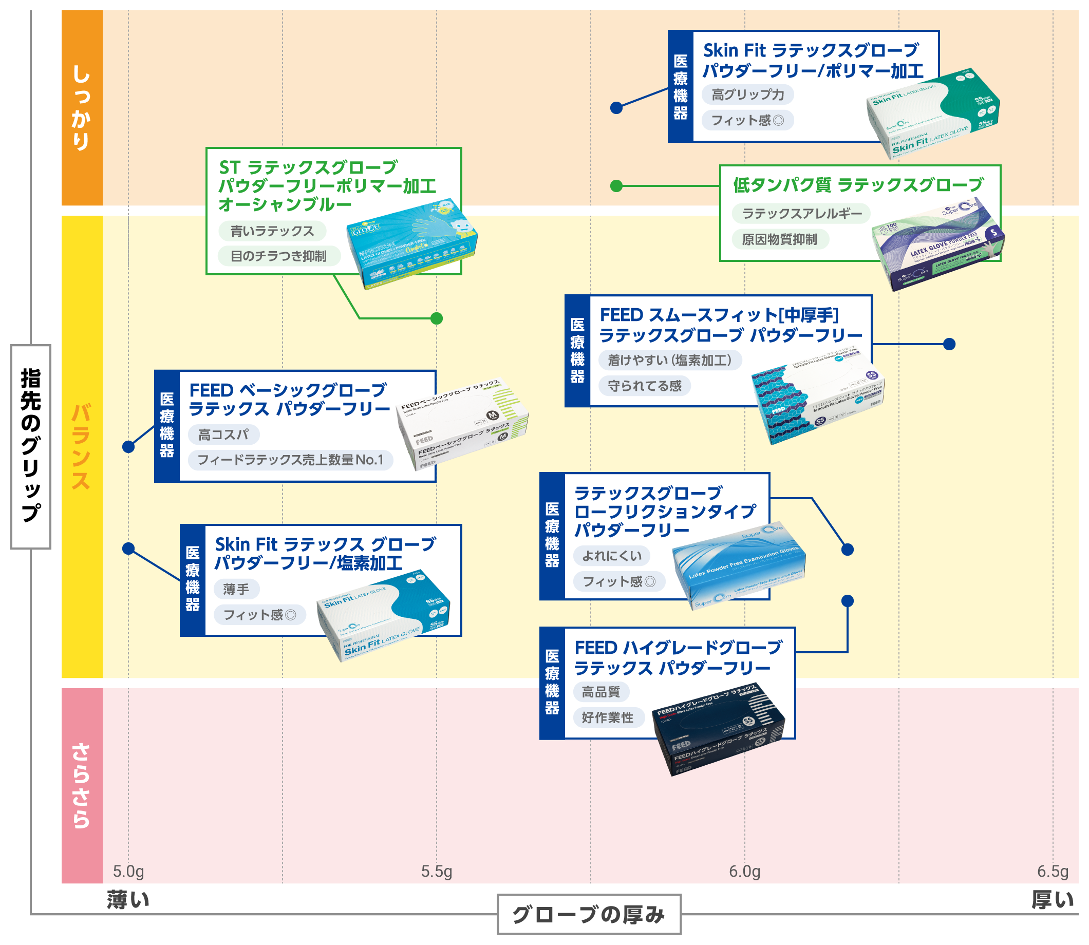 ※グリップ力については、フィード社員による評価になります。グラム数はメーカー仕様で定められているMサイズ1枚当たりの重さです。