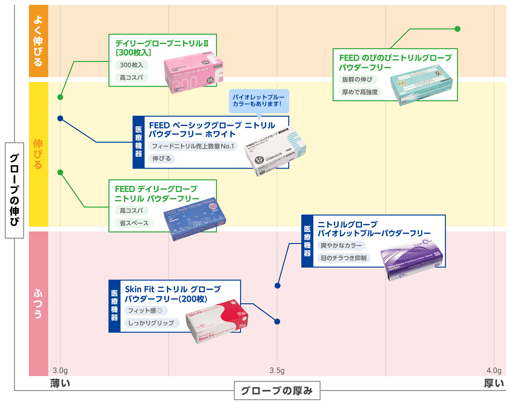 日々の診療に欠かせないグローブ。フィードのオリジナルグローブは厳しい審査基準をクリアし、医院様の好みを見つけていただけるよう、バラエティ豊富な材質・グリップ感・厚さのグローブをご用意しております。