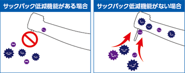 サックバック現象とは、回転停止時にハンドピースヘッド外装周辺、またはバーに付着した唾液や血液等の体液、空気中の粉塵などがハンドピース内部に吸い込まれることを指します。