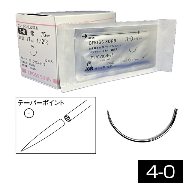 ●商品コード: 3945608●入数: 12本●メーカー型番: T17CV04H-75●先端形状: テーパーポイント●針長: 17mm●湾曲: 強湾●USP.No: 4-0●糸長: 75cm●材質: ポリグリコール酸●糸色: 紫●販売名: クロスソーブ●薬事表示番号: 医療機器承認番号16000BZZ01950000