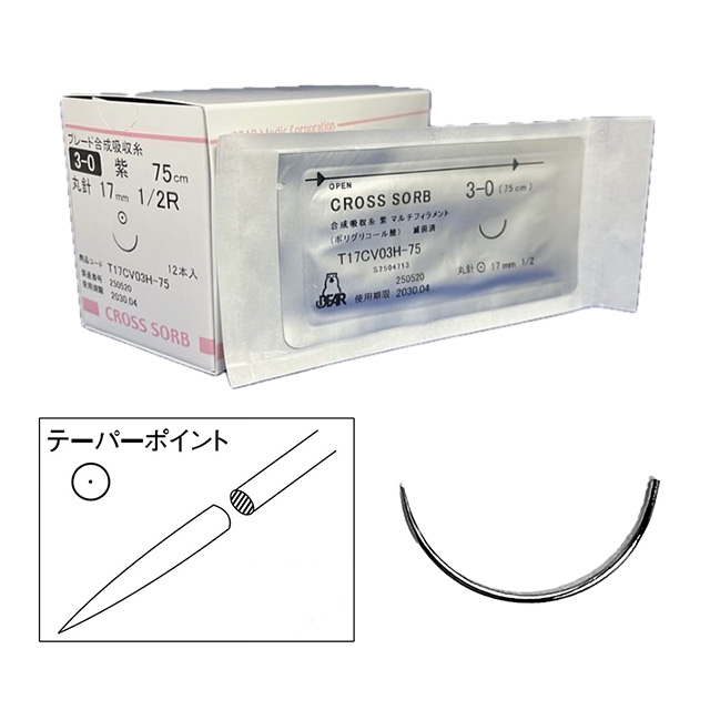 ●商品コード: 3949962●入数: 12本●メーカー型番: T17CV03H-75●先端形状: テーパーポイント●針長: 17mm●湾曲: 強湾●USP.No: 3-0●糸長: 75cm●材質: ポリグリコール酸●糸色: 紫●販売名: クロスソーブ●薬事表示番号: 医療機器承認番号16000BZZ01950000