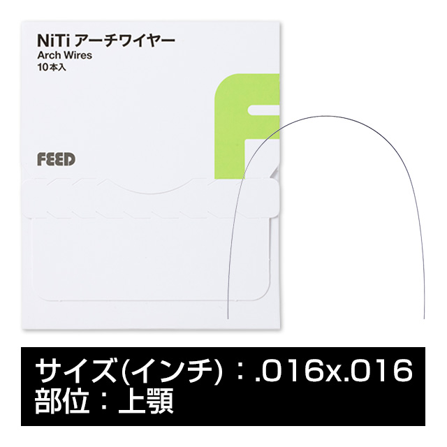 ●商品コード: 8592163●入数: 10本●サイズ(インチ): .016×.016●形状: /スクエア●材質: ニッケルチタン●部位: 上顎●販売名: FEED NiTiアーチワイヤー●薬事表示番号: 医療機器認証番号307AKBZX00059000