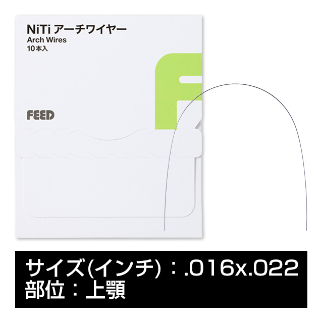 ●商品コード: 8590340●入数: 10本●サイズ(インチ): .016×.022●形状: レクタンギュラー●材質: ニッケルチタン●部位: 下顎●販売名: FEED NiTiアーチワイヤー●薬事表示番号: 医療機器認証番号307AKBZX00059000