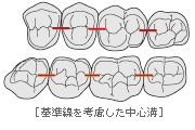 上下臼歯の咬合面近遠心辺縁隆線部に凹型の切り込みがあり、隣接臼歯の凹方部を揃えることにより排列を容易に行える。