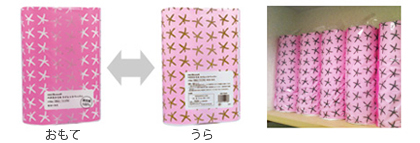 従来品のような「いかにもトイレットペーパー」というパッケージを一新して「見られる場所にストックしたいパッケージ!」にしました。裏と表でカラーデザインが異なり、表は赤系、裏はピンク系になっていますので、お好みの向きに置いて、楽しくストックしてください。