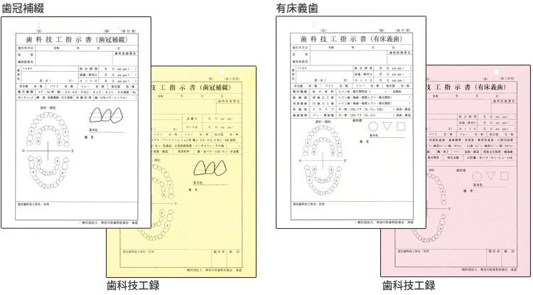 歯冠補綴と有床義歯の2種類から選べる、全国で使える技工指示書です。
