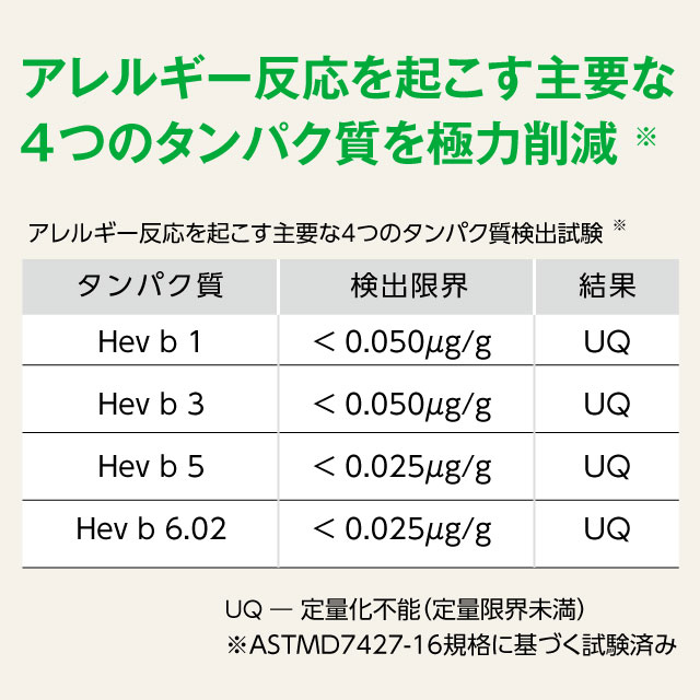 当商品はラテックスアレルゲンとして登録されているタンパク質のうち、 主要なタンパク質4種の量を検出できないという試験結果が出ています。※
