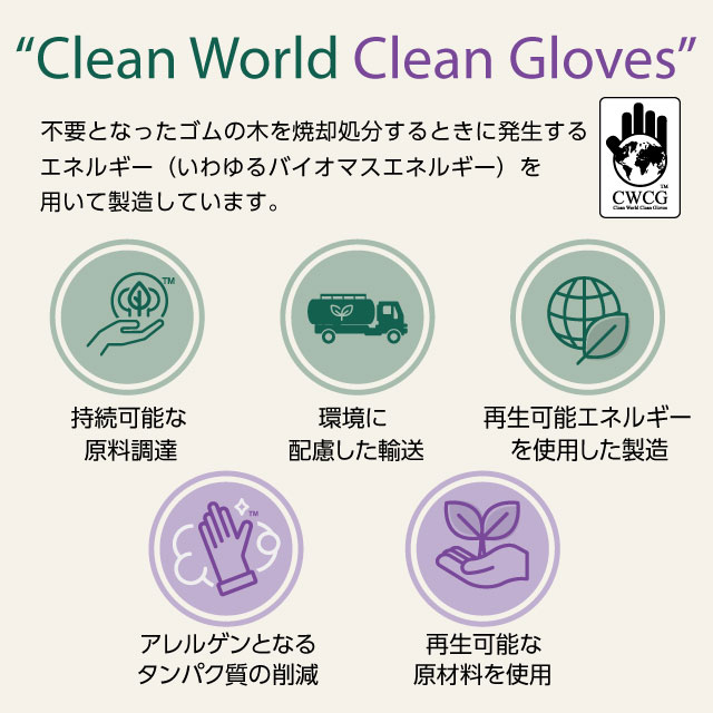 当商品は、環境への負荷軽減を目指す CWCG(Clean World Clean Glove)というメーカー自主基準に基づき、 不要となったゴムの木を焼却処分するときに発生するエネルギー(いわゆるバイオマスエネルギー)を用いて製造しています。