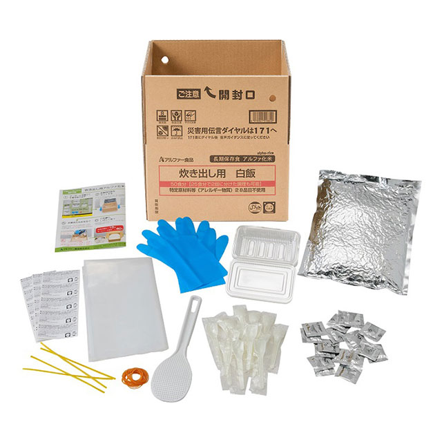 お湯または水を注ぐだけで使用できる災害用炊き出しセットです