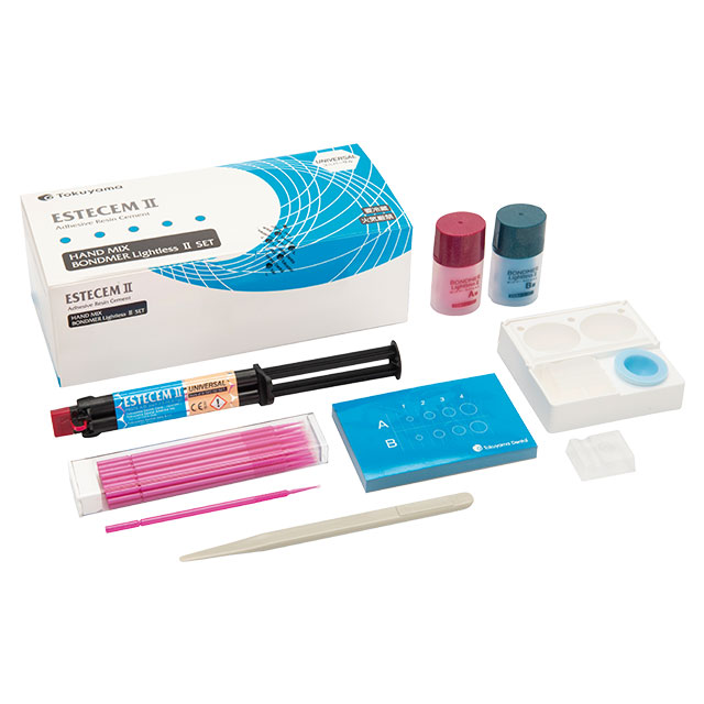 ●商品コード: 7721241●入数: 1セット●セット内容: ペーストA2.3mL(4.7g)/B2.3mL(4.7g)(ユニバーサル)×1、 ボンドマーライトレス2 A液3mL×1 、 ボンドマーライトレス2 B液2.4mL×1、ミニブラシ(ファイン)×25、ボンドマー用混和皿×1、練和紙No.10×1、セメントヘラ ×1、ディスポ混和皿×5●販売名: エステセム2●薬事表示番号: 医療機器認証番号228AFBZX00129000