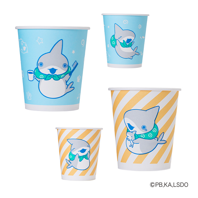 子ザメちゃんがデザインされたカラフルな2柄アソート紙コップ。