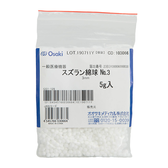 ●商品コード: 5554746●入数: 1パック●メーカー型番: No.3●サイズ: φ3mm●内容量: 5g●販売名: スズラン綿球●薬事表示番号: 医療機器届出番号23B3X00006000030
